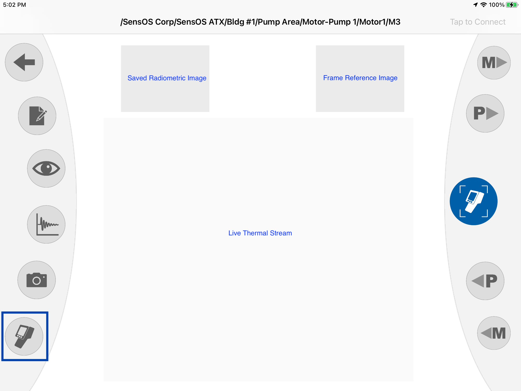 - Navigate to the desired point and turn on the wireless camera (connect camera for wired), the app will scan for the available camera and connect to it. Once connected the thermal image stream will appear on the screen and if it is the first thermal image for an asset there will be no reference frame.